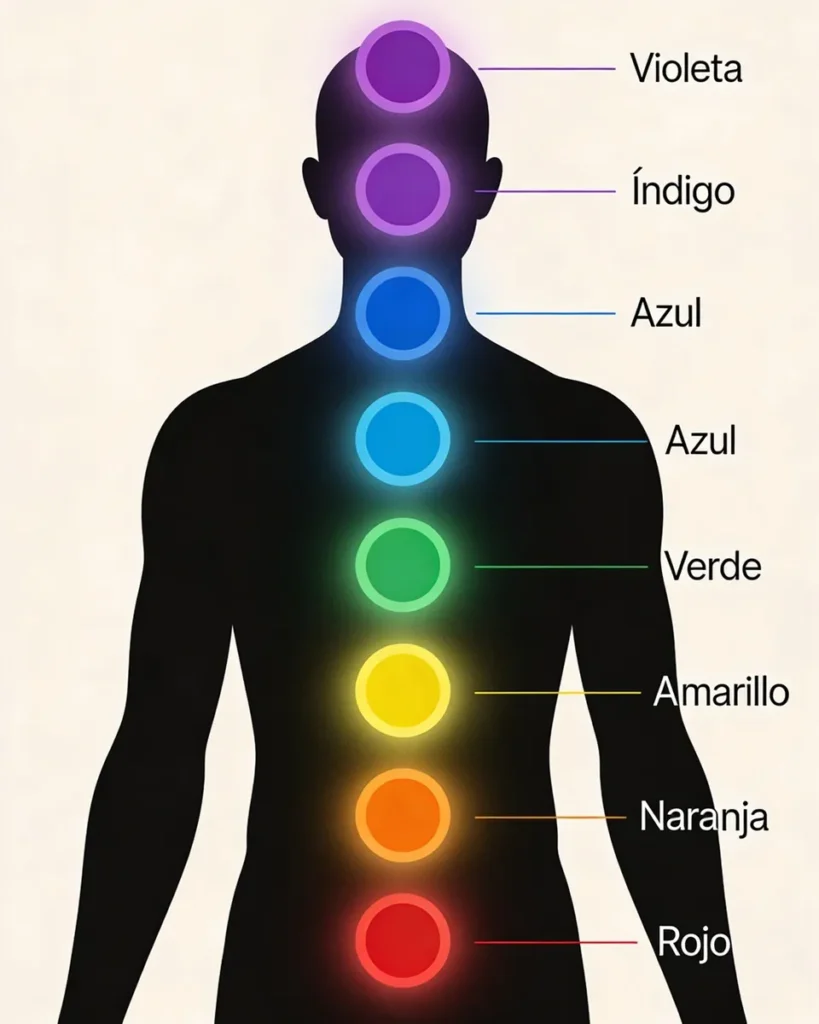 Aunque existen diferentes sistemas, en Occidente el modelo más conocido es el de siete chakras principales alineados desde la base de la columna hasta la coronilla. Cada uno se asocia a una zona del cuerpo, un color, determinadas funciones y tipos de experiencias.