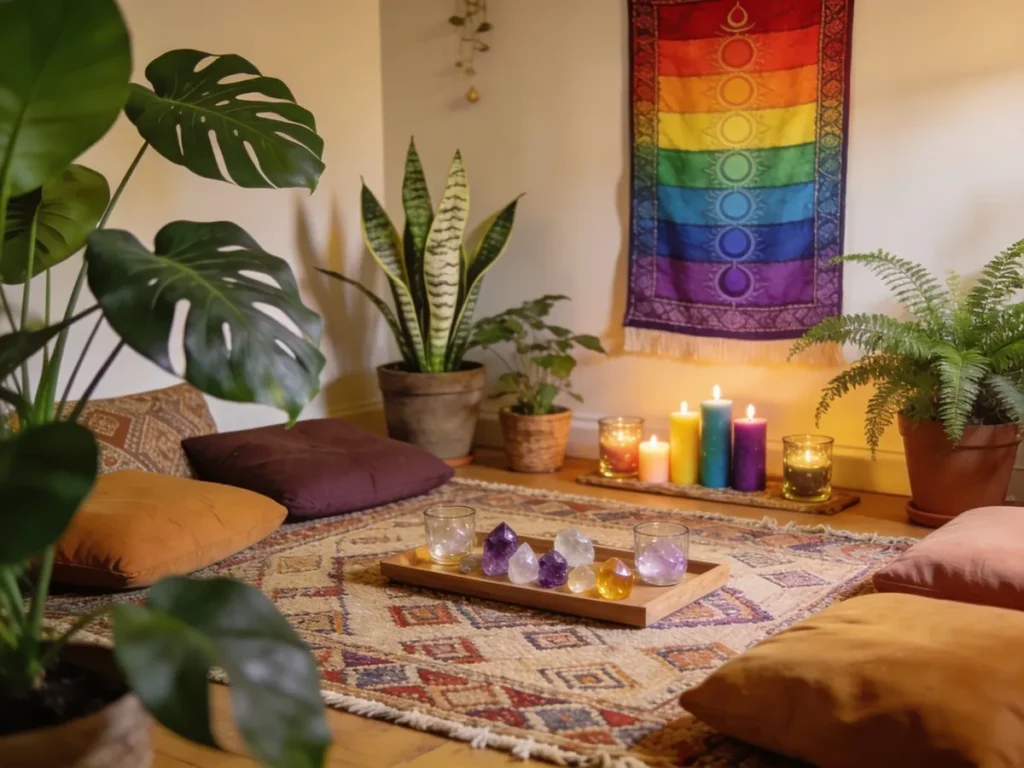 - Ritual de mañana en tu rincón chakra: levantarte, encender una vela o un incienso y sentarte unos minutos junto a tu pieza decorativa favorita (un móvil de vidrio, un tapiz, un cuadro de chakras), mientras respiras conscientemente.