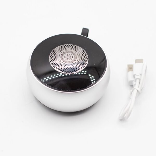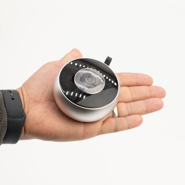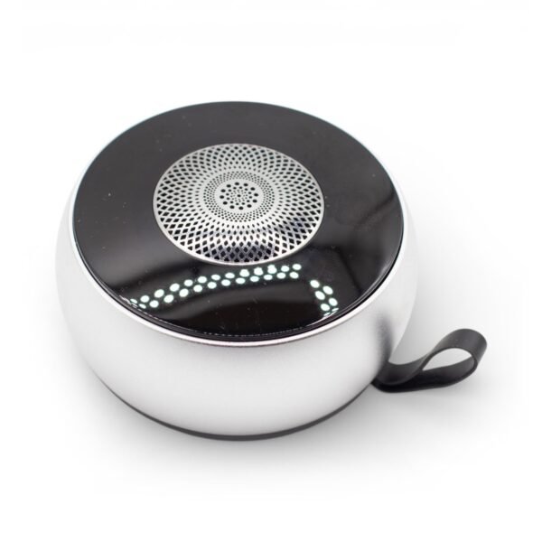 Descubre la combinación perfecta entre elegancia y portabilidad con este mini altavoz inalámbrico de acabado plateado. Su diseño circular y ergonómico ha sido pensado para adaptarse cómodamente a la mano, convirtiéndolo en el accesorio ideal para llevar tu música a todas partes. La estética moderna del dispositivo destaca por su cuerpo metalizado y una superficie superior negra que integra una rejilla con patrón geométrico, bajo la cual se proyecta un hipnótico efecto de iluminación LED estilo mandala mientras disfrutas de tus canciones favoritas.