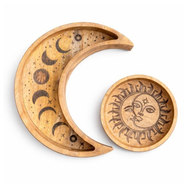 Set de 2 Bandejas Celestiales de Madera de Mango – Diseño Sol y Luna para Cristales y Altar