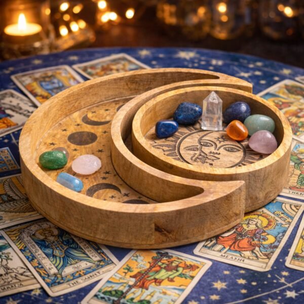 Este juego de dos piezas, que incluye una bandeja en forma de luna creciente y una bandeja circular con grabado solar, es el complemento perfecto para quienes buscan armonía entre estética y espiritualidad. Diseñadas para encajar entre sí o utilizarse por separado, transformarán cualquier rincón en un espacio sagrado.