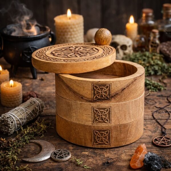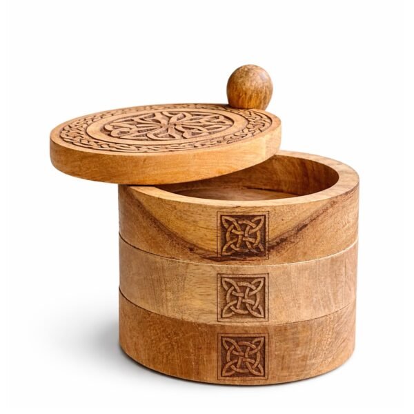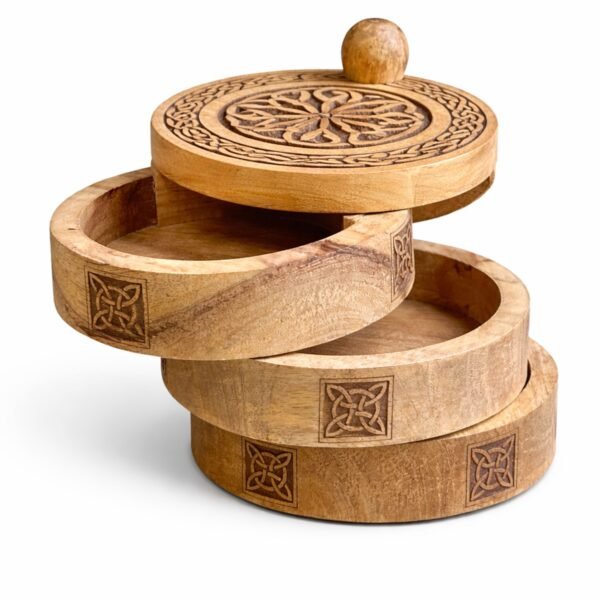 Caja Giratoria Celta de 3 Niveles en Madera de Mango – Organizador de Altar y Joyero Artesanal