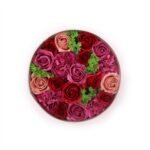 Caja redonda “Rosas Vintage” con flores de jabón en una combinación de tonos rojos, rosas y malvas, presentada en un estuche circular elegante y lista para regalar. Es perfecta como detalle romántico, decoración o regalo especial para cumpleaños, aniversarios y ocasiones señaladas.