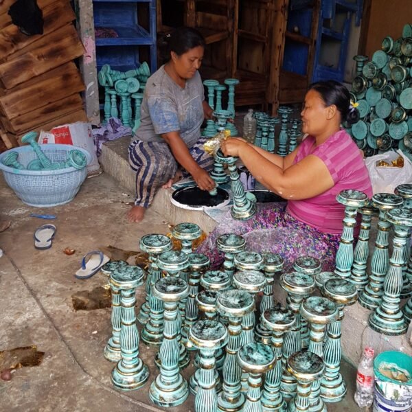 Este candelabro aúna elegancia y artesanía tradicional en una pieza decorativa que destaca por su diseño romántico y su acabado envejecido. Fabricado en madera de albesia tallada a mano, presenta una estética vintage con detalles ornamentales que aportan personalidad a cualquier rincón del hogar. Su base amplia garantiza estabilidad, mientras que el fuste con molduras y relieves muestra el trabajo artesanal que hay detrás de cada unidad.