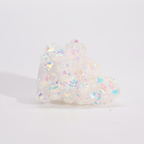 Esta pieza presenta un delicado tono blanco lechoso con reflejos iridiscentes en suaves matices pastel, que crean un efecto luminoso y elegante. Se trata de un cuarzo natural realzado con acabado Angel Aura, un tratamiento que aporta ese brillo nacarado y multicolor que resalta las formaciones del cristal y le da un aspecto etéreo muy atractivo para la decoración.