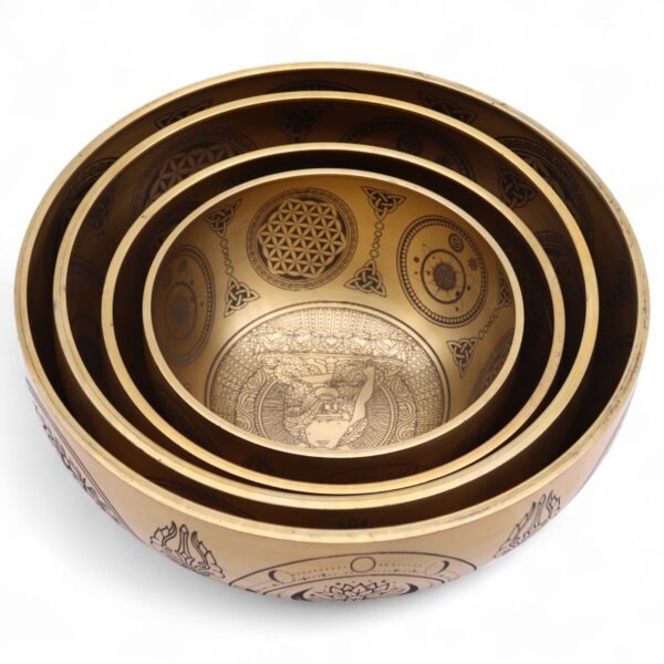Esta exclusiva colección de cuatro piezas representa la unión perfecta entre la maestría artesanal y la profundidad espiritual. Cada cuenco ha sido elaborado cuidadosamente en latón puro, un material noble que no solo garantiza durabilidad, sino que también permite una resonancia acústica excepcional. El diseño destaca por sus intrincados grabados manuales que recorren tanto el interior como el exterior de las piezas, mostrando una rica simbología yóguica que incluye mantras, chakras y figuras sagradas en posturas de meditación.