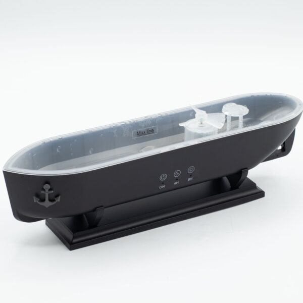 Un difusor decorativo de aroma diseñado en forma de un barco clásico, que presenta un suave efecto de niebla que se eleva desde las chimeneas para crear una exhibición tranquila y atmosférica mientras perfuma suavemente la habitación.