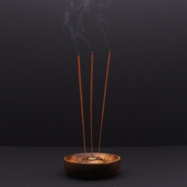 La pieza cuenta con una estructura cóncava ideal para recoger las cenizas de forma limpia y segura. En su centro dispone de un soporte de metal dorado diseñado específicamente para sostener un cono de incienso, rodeado por cuatro orificios estratégicamente situados para colocar varias varillas de forma simultánea. La madera de mango ofrece un acabado cálido con tonalidades marrones variadas que realzan la belleza natural del material.