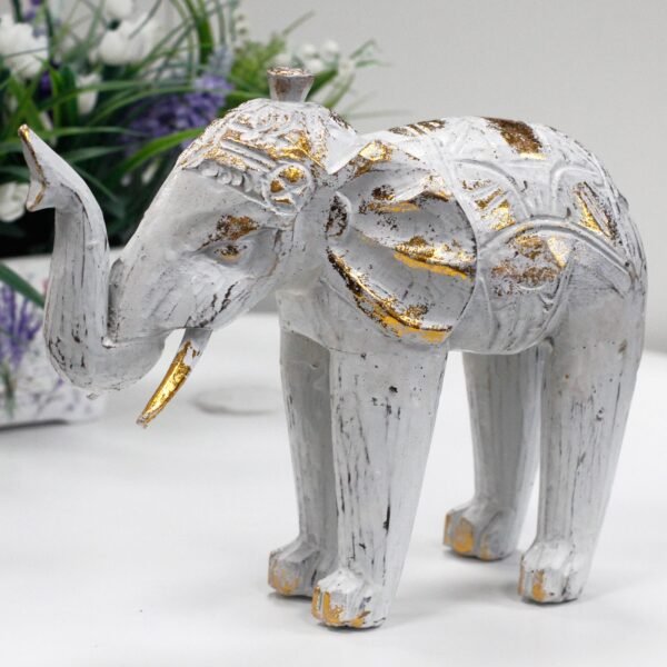Con dimensiones generosas de 27 cm de largo, 24 cm de alto y 8 cm de ancho, esta escultura imponente se erige como punto focal en salas, entradas o estanterías, aportando calidez orgánica y presencia escultórica sin esfuerzo. El acabado distressed en blanco con toques dorados resalta las vetas de la madera tallada manualmente, haciendo de cada elefante una creación única que varía en matices y profundidad de grabados.