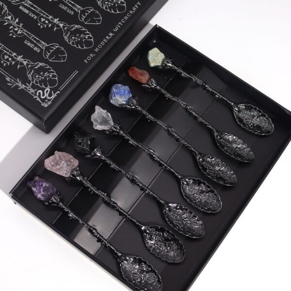 Cada cuchara presenta un diseño ornamentado, con relieves decorativos en el mango y la pala, que refuerzan su aspecto artesanal y su inspiración en el mundo esotérico. Las piedras naturales colocadas en la parte superior añaden color, textura y personalidad, haciendo que cada pieza destaque por sí misma dentro del set. El conjunto incluye amatista, cuarzo rosa, obsidiana negra, cuarzo roca, lapislázuli, ágata roja y aventurina verde, creando una combinación equilibrada y muy atractiva.