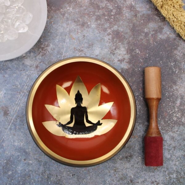 Este juego de cuenco tibetano de gran tamaño combina un diseño decorativo llamativo con una presentación completa, pensado tanto para uso personal como para regalo. El interior del cuenco presenta una ilustración de Buda en color negro sobre un fondo naranja, enmarcada por un motivo tipo flor de loto, creando un contraste visual muy atractivo. El borde en tono dorado resalta el acabado y aporta un aspecto cuidado y elegante al conjunto.