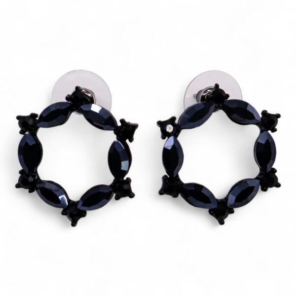 El tono negro aporta una sensación de fuerza, misterio y versatilidad, convirtiéndolos en un complemento fácil de integrar en una amplia variedad de estilos. Su diseño circular transmite equilibrio y continuidad, mientras que las piezas de vidrio facetado añaden textura y dinamismo, creando un contraste atractivo entre luz y sombra.