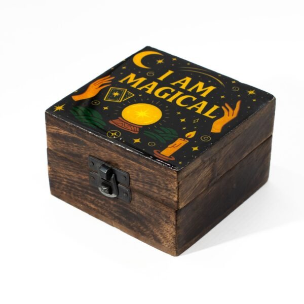 Esta pequeña caja de madera de mango es un recordatorio silencioso del poder interior y la intuición. La tapa esmaltada presenta el diseño I Am Magical, lleno de símbolos de cartas del tarot, una bola de cristal, la luz de las velas y manos que guían, todo bajo un cielo nocturno estrellado.