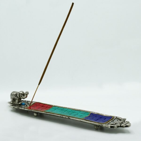 Lo más destacado de este porta-incienso es su elaborado mosaico artesanal. La superficie metálica está recubierta por teselas de colores vibrantes en tonos azul cobalto, turquesa y rojo intenso, dispuestas en bloques que crean un contraste dinámico y elegante. Los bordes están decorados con un delicado patrón de cuentas doradas que realzan el acabado plateado de la estructura. En uno de los extremos, una detallada figura de cabeza de elefante tallada en metal preside la pieza, simbolizando la sabiduría y la buena fortuna según la tradición de su país de origen, India.