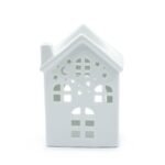 Esta pieza de cerámica artesanal destaca por su encantador diseño en forma de pequeña casa, ideal para aportar una sensación de hogar y calidez a cualquier estancia. Presenta un acabado en color blanco puro con un brillo vitrificado que resalta su silueta geométrica, la cual incluye detalles arquitectónicos como un tejado a dos aguas y una pequeña chimenea lateral. Es un elemento decorativo que combina la sencillez del minimalismo con un trabajo de calado detallado.