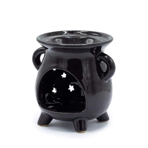 Esta pieza artesanal presenta una estética mística y elegante, diseñada para convertirse en un punto focal en cualquier espacio de relajación o meditación. Fabricada en cerámica con un acabado negro brillante de gran profundidad, su forma recuerda a un pequeño caldero tradicional, aportando un aire clásico y atemporal. La estructura se apoya firmemente sobre tres patas redondeadas y cuenta con dos asas laterales curvas que equilibran visualmente el conjunto.