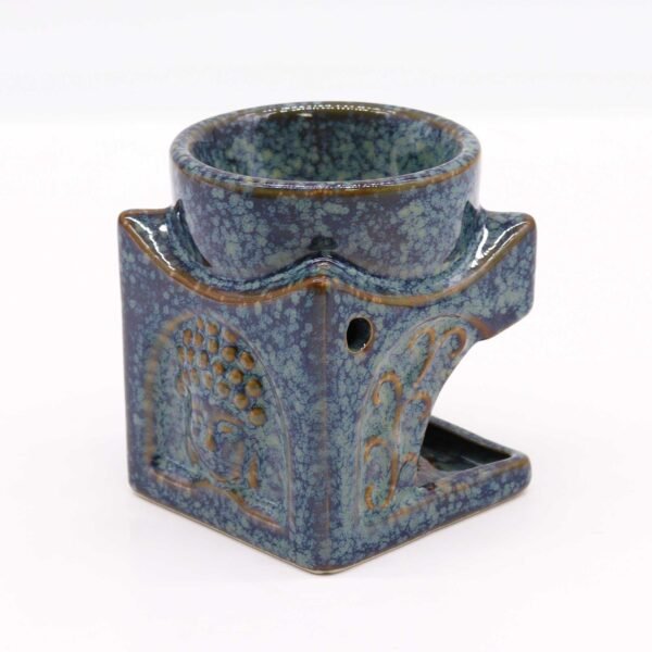 En la parte frontal, destaca un relieve detallado del rostro de Buda en estado de meditación. Los bordes de esta figura, junto con los perfiles superiores del quemador, muestran matices en tonos terrosos y cobrizos que contrastan elegantemente con el azul predominante, aportando profundidad y un carácter antiguo a la pieza. Este simbolismo espiritual lo convierte no solo en un objeto funcional para la aromaterapia, sino también en un potente elemento decorativo que transmite equilibrio y serenidad.