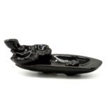Quemador de Incienso Reflujo Inverso – Estanque de Loto y Porta Incienso de 16,5 x 8 x 6 cm es una escena cerámica negra brillante con tres flores de loto elevadas sobre base ovalada rectangular que forma estanque para humo. Fabricado en China, integra porta para varilla y backflow con acabado esmaltado pulido.