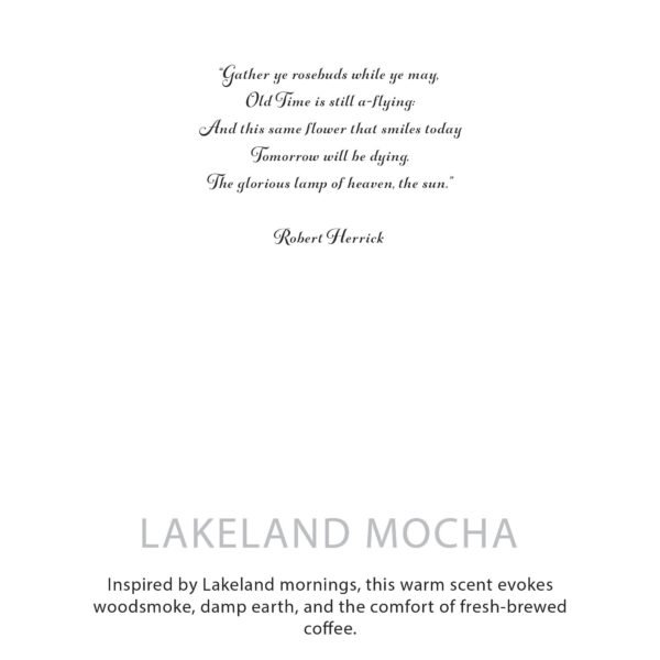 La vela de cera de soja botánica Agnes + Cat – Lakeland Mocha está inspirada en las apacibles mañanas del Distrito de los Lagos. Su fragancia cálida y envolvente combina notas de café recién tostado, cacao suave y un fondo terroso y húmedo que evoca la naturaleza al amanecer.