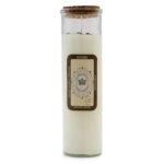 En su interior reposan gemas de Amatista, la piedra maestra de la transmutación y la sabiduría. La amatista es célebre por potenciar la intuición y la claridad espiritual, cualidades indispensables para tomar decisiones acertadas en los negocios y la vida personal. Visualmente, el púrpura de las piedras contrasta con la cera blanca dentro de su elegante cilindro de vidrio, creando una pieza que irradia sofisticación y propósito.